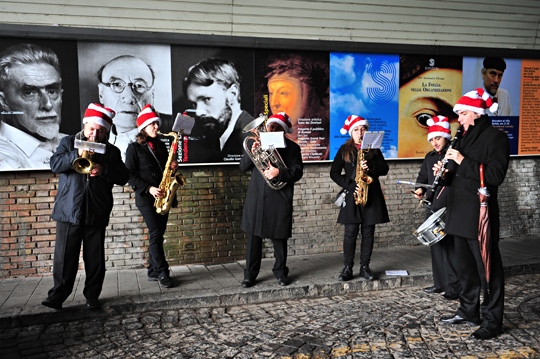 その時、サンタの帽子をかぶった音楽隊に遭遇。