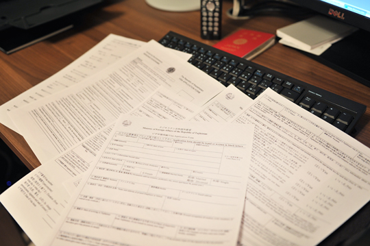 ビザ申請用紙に囲まれ…