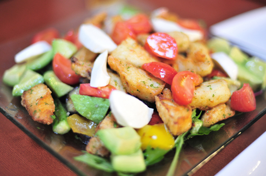 ヒラメのフライが乗ったいろいろサラダ。