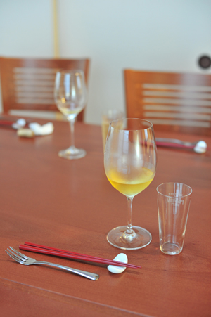 和室にダイニングテーブル、箸にワイングラス、どこかの和風フレンチのお店みたい。