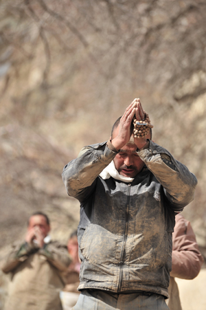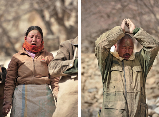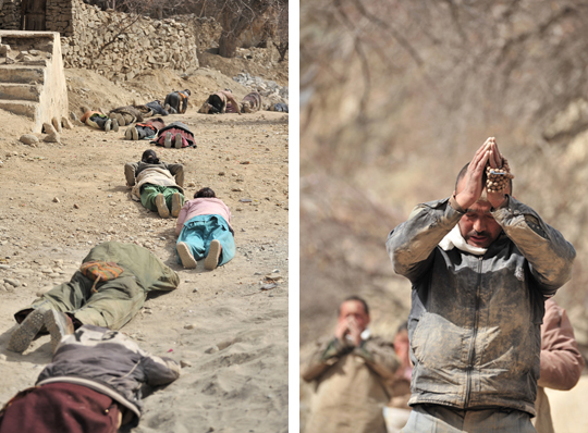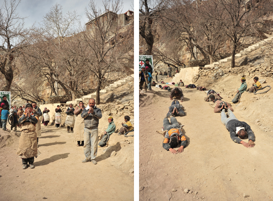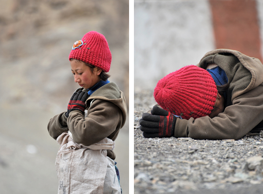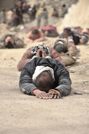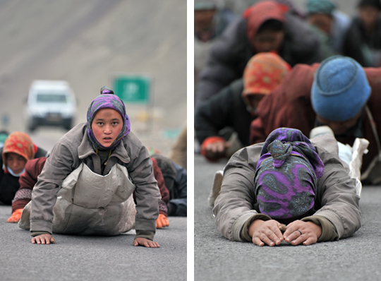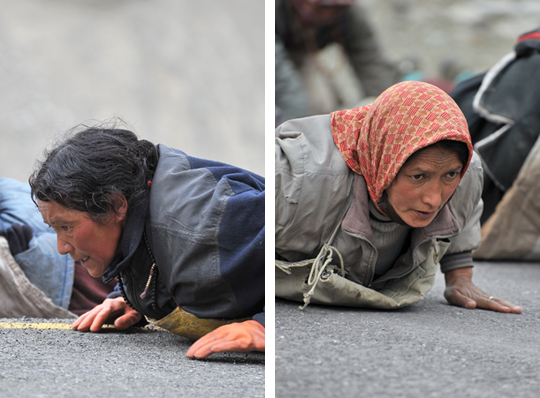 体中埃まみれになりながら、ひたすら五体投地を続け、わずかに距離を進めていいきます。
