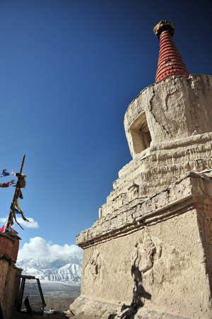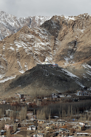↑ ナムギャル・ツェモという岩山。岩山の上にはゴンパ(お寺)がある。