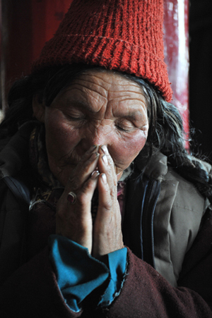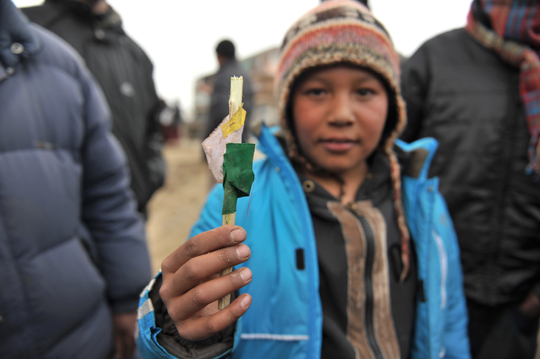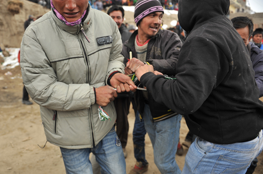 村人たちはゴンパ前の広場に集まり、マニ車(中に経文の入った円筒型の宗教用具)をぐるぐる回している。その傍らで、子供たちにクッキーなどのお菓子が配られていました。
