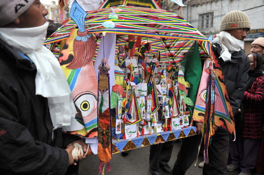 僧侶たちが山から下りて来て、“ド”と呼ばれる鮮やかな糸を張りめぐらせた祭壇と共にメインバザール(町のメイン通り)を練り歩きます。