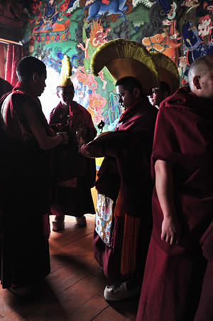 広場から階段を上ったところにある小さなお堂が控え室になっていて、ここで僧侶たちは慌しく着替えをしていました。