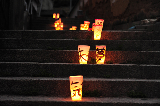 灯りをともす子供たちがチャカマンを持って傾斜の激しい階段を走り回っていました。