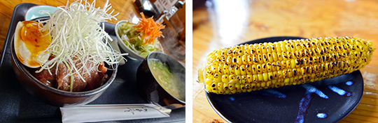 阿蘇の大パノラマを見ながら頂いた名物・倍喰丼(バイクドン)と焼きトウモロコシ。