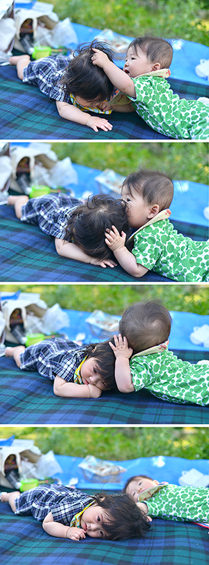 うちの息子、自分より小さな赤ちゃんに、髪引っ張られても、ヨダレ垂らされても、乗っかられても、びくとも抵抗せずされるがまま。