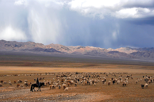 東トルキスタン、天山山脈北側のルート天山北路を西へ。 セリム湖一帯はチベットのような乾燥した風景で、私好みでした。 それに相成って、どんよりした天気。今にも雨が降り出しそうな匂い。 と思ったら、山の方では雨が降り出し、神秘的な空に。 あーこういう瞬間が大好きだー!と撮った一枚です。