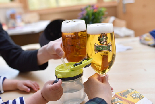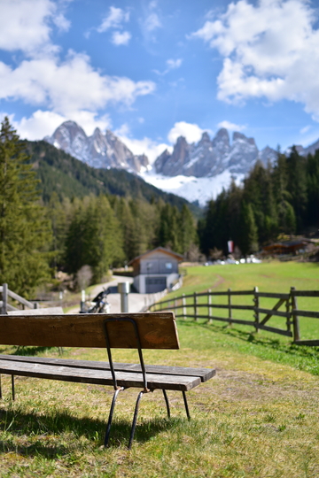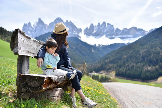 ガイスラー山群と息子。雄大なところでお菓子を食べてます。