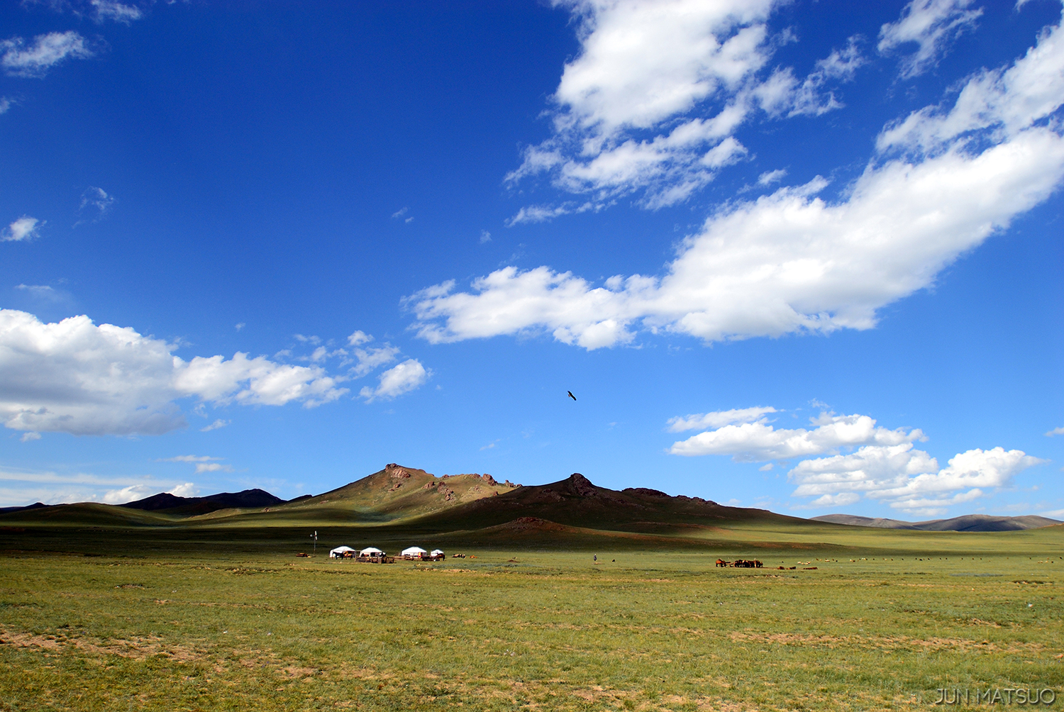 夏らしい爽快な草原風景。モンゴル、テルヒン・ツァガーン近辺。