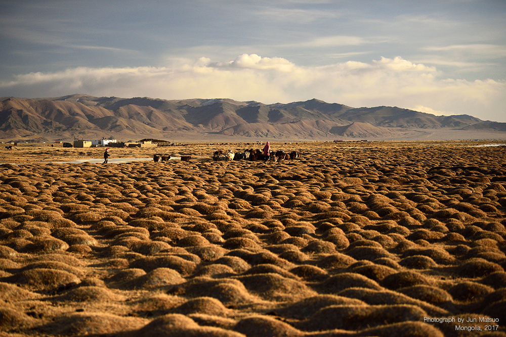 写真は、鷹匠が多く暮らす村郊外の風景。鷹匠もふだんは他の遊牧民と変わらない暮らしをしています。家畜は羊にヤギ、馬、ヤク、ラクダ。早朝から乳を絞り、広大な大地に散らばった家畜の糞を拾い、放牧をします。木が乏しい土地なので、糞が燃料になります。トラック一台分で2000円強の収入です。