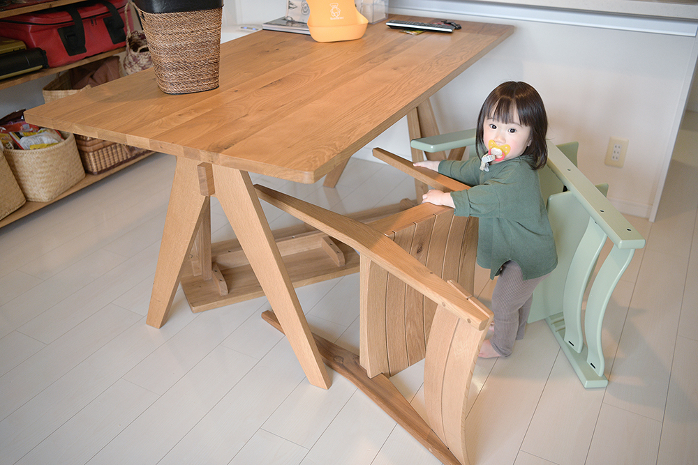 ちょっとよそ見している間に、大人の椅子に登り、そこからダイニングテーブルの上に登って遊ぶので、危ないので、我が家のダイニングは最近ずっとこんな感じ。