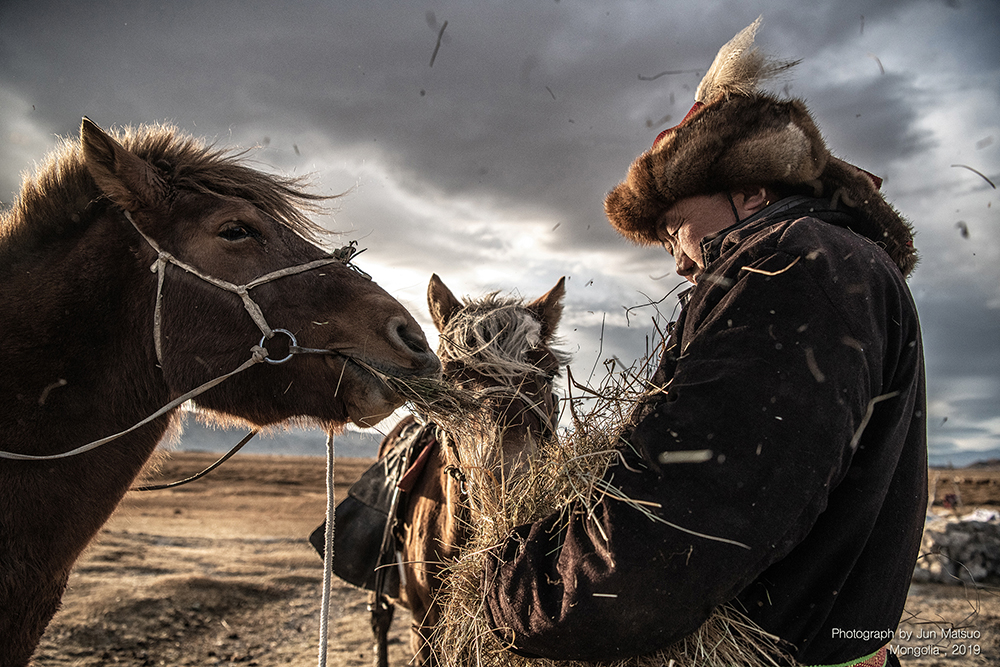 2019年秋、モンゴルでの写真。一日中ハンティングして帰ってきて、お馬さんの餌やり。私みたいな素人を乗っけてお疲れ様でした♡