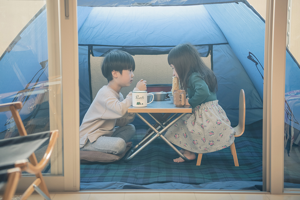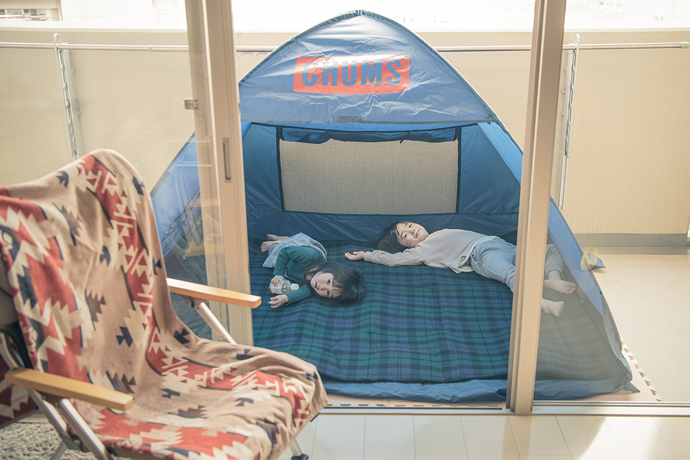 ご飯もここで食べて、遊ぶのもこの中で、寝るのもここがいいと言ってます。テントを部屋に入れて寝させようか?