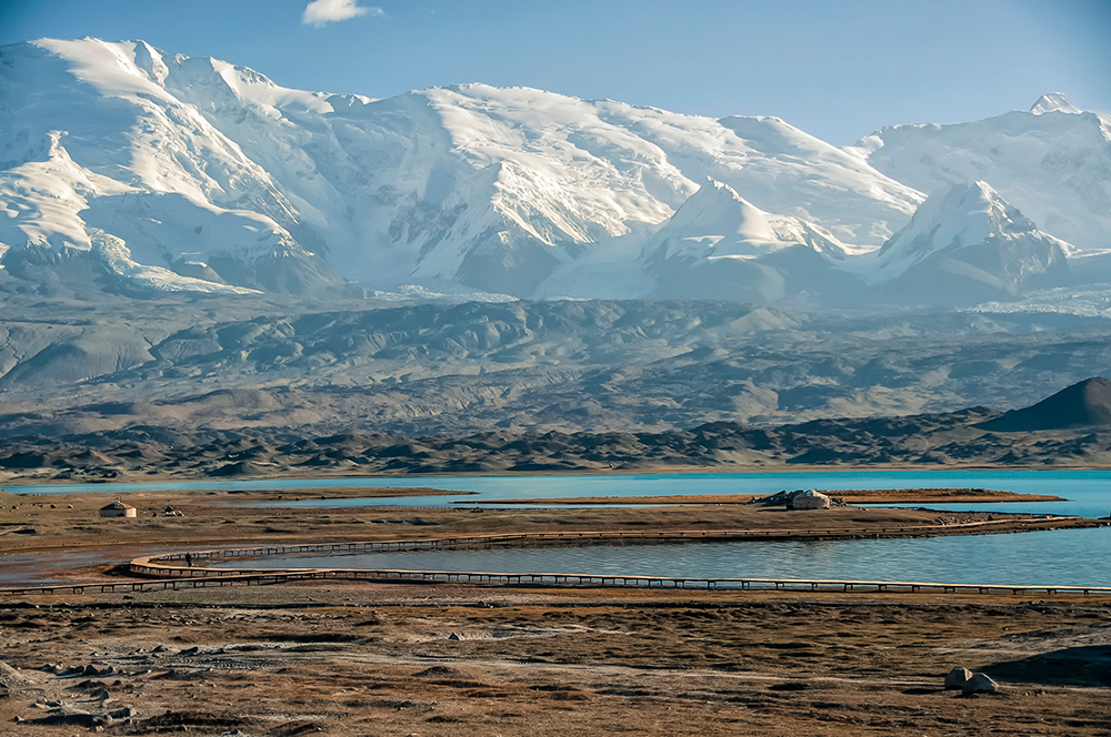 かつてのシルクロード。カラコルムハイウェイ(中パ公路)を走っていた時の沿道からの景色。 カラクリ湖と、背後に聳えるのは7,000m級のカラコルム山脈。大迫力でした。 この道は東トルキスタン(新疆ウイグル自治区)から国境の町タシュクルガンを通り、パキスタンへと続きます。 ロマンですねぇ