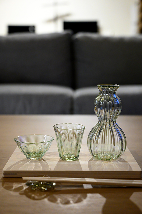 収穫後の畑に残ったれんこんの葉や根や花を、乾燥させ燃やして「灰」にし、ガラスの原材料に混ぜ込んだら、綺麗な若緑色のガラスになったとか。