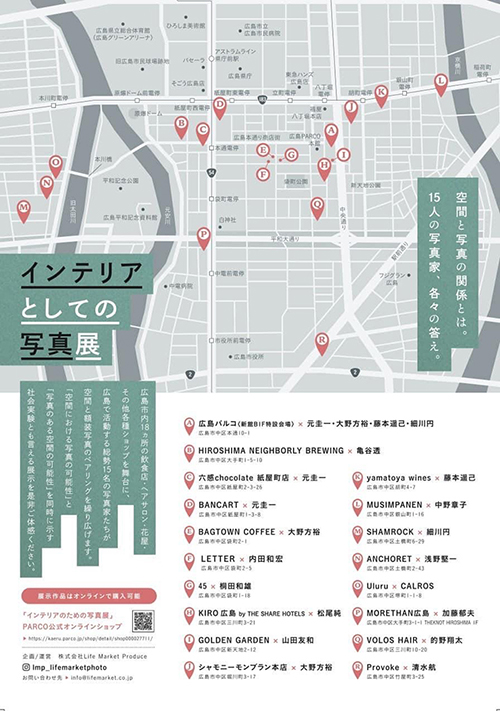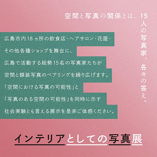 広島市内18ヶ所の飲食店・ヘアサロン・花屋・そのほか各種ショップを舞台に、広島で活躍する総勢15名の写真家たちが空間と額装写真のペアリングを繰り広げます。